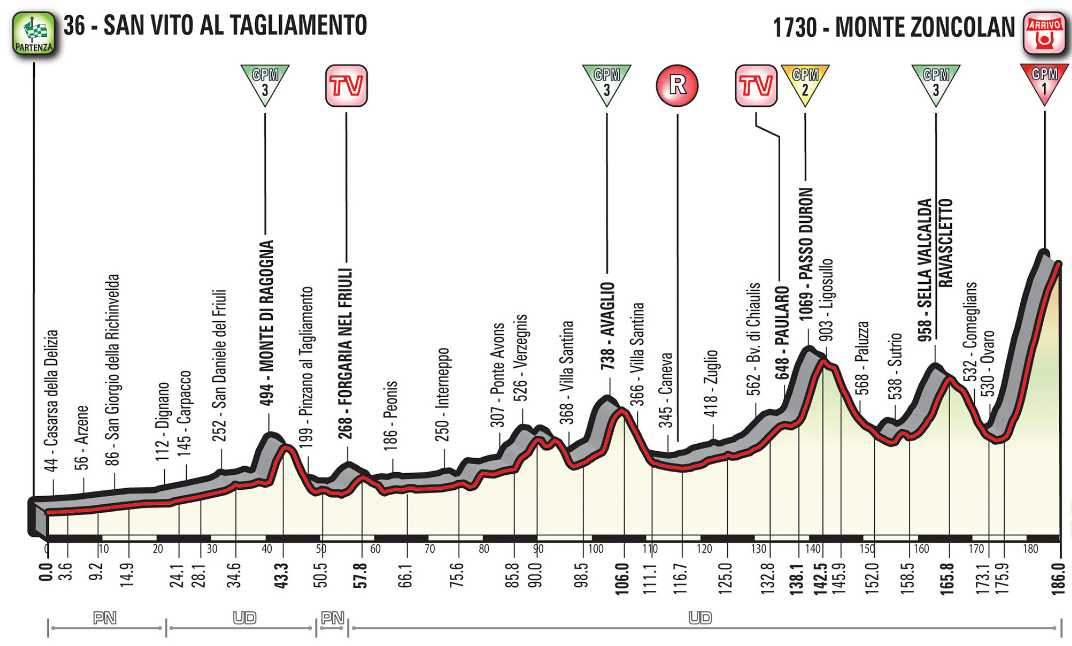 Sul percorso ci saranno altri quattro GPM tra i quali non sarà da sottovalutare il Passo Duron, 4,4 km con tratti al 18%. Difficile che le polveri si accendano già qui, a oltre 40 km dall’arrivo, ma qualche temerario di giornata potrebbe approfittarne per mettere in cascina secondi preziosi da spendere sulla temuta salita finale che torna al Giro dopo 4 anni e verrà affrontata dal versante di Ovaro. Quella del Monte Zoncolan è considerata la salita più dura d’Europa. 10,1 km con pendenza massima al 22% e una parte centrale al 15,4% che in passato ha visto trionfare Simoni, Basso, Anton e, nel 2014, l’inatteso cronoman australiano Michael Rogers.