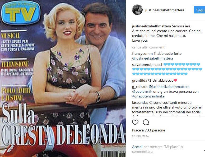 Inoltre, anche nei suoi show la presenza femminile fu sempre un elemento centrale, rappresentato dapprima dalla cagnolina irriverente Floradora e poi dalla Marylin italiana, Justine Mattera, che fu sua moglie dal 2000 al 2002 (nella foto). Mattera presenziava negli show di Paolo Limiti vestita come l’attrice americana.